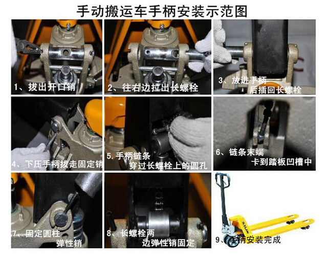 目前,越來越多的場所都會看到手動搬運車的身影,重量輕,容易操作,價格低,又經濟實用。特別適用于汽車裝卸及車間、倉庫、碼頭、車站、貨場等地的易燃、易爆和禁火物品的裝卸運輸設備。下面北京凌鷹技術人員來教你地牛手柄的安裝,詳情如下: