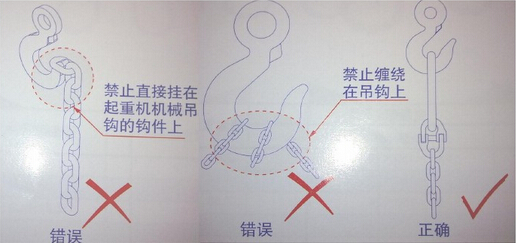 4.承載鏈條索具禁止直接掛在起重機(jī)吊鉤的鉤件上或纏繞在吊鉤上。