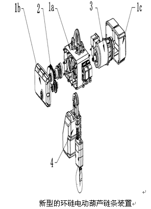 新型的環鏈電動葫蘆鏈條裝置采用在鏈輪外側設一導鏈環,有效的減少了在鏈輪轉動過程中鏈條容易脫鏈所帶來的風險,同時在導鏈環的鏈條進、出口設有導鏈板,也可以有效的防止鏈條脫鏈,同時在導鏈板上設有用于導鏈的十字形溝槽,該十字形溝槽主要起到導鏈作用,同時保證鏈條在鏈輪上運行平穩。