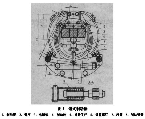 鉗式制動(dòng)器結(jié)構(gòu)如圖1.它的主要制動(dòng)臂1、臂座2、電磁鐵3、制動(dòng)輪4、轉(zhuǎn)臂7和制動(dòng)彈簧8組成。它是常閉式制動(dòng)器,通電時(shí)起升電動(dòng)機(jī)旋轉(zhuǎn),輸力矩起吊載荷,同時(shí)制動(dòng)器電動(dòng)器電磁鐵吸合,打開(kāi)制動(dòng)器;切斷電源時(shí),起升電機(jī)制動(dòng),鉗式制動(dòng)器電磁鐵打開(kāi),制動(dòng)臂在彈簧力的作用下抱緊制動(dòng)輪制動(dòng)載荷,電磁鐵是長(zhǎng)行程電磁鐵。