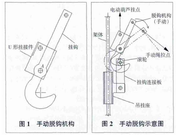 手動脫鉤工作原理。如圖2所示,掛鉤通過滾輪把架體鉤住,電動葫蘆通過U形連接件連接,把架體吊掛在附著處,當(dāng)掛鉤被人用繩索拉動并繞A點轉(zhuǎn)動時,掛鉤下部圓弧逐步速脫開滾輪,脫開后架體失去支承而墜落。
