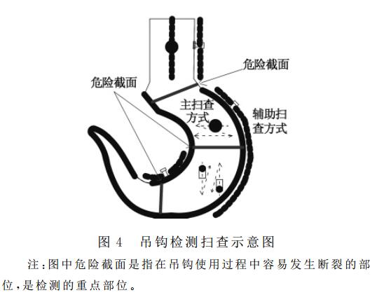 為防止缺陷漏檢,按圖4進行掃查直探頭采用接觸式在鉤柄圓柱、鉤腔、鉤腔外圓弧和鉤頭一側(cè)表面垂直于鍛造流線方向做鋸齒形掃查。掃描線按聲程1:1調(diào)節(jié),以2平底孔為掃 查靈敏度,3平底孔為評定線靈敏度,耦合補償用試塊和工件實際測定。斜探頭在鉤頭兩側(cè)面沿鍛造流線方向做平行掃查和斜探頭在鉤腔內(nèi)表面垂直于鍛造易折疊部位做鋸齒型掃查,掃描線速度按聲程1:1調(diào)節(jié),靈敏度按2.4.3調(diào)節(jié),耦合補償用試塊和工件實際測定。確因鍛件幾何形狀的限制而掃查不到的部位,應(yīng)予以記錄和圖示,必要時還應(yīng)得到各方同意。