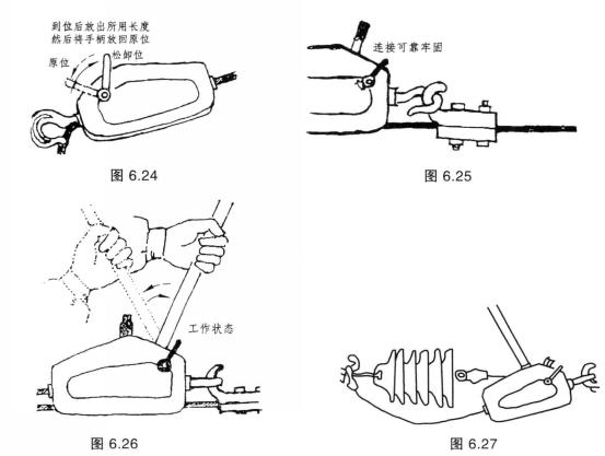 4、操作時,先確認松卸手柄已扳到“工作位置”,然后用葫蘆把圓頭(操作手柄)套在前進桿上來回擺動,收緊牽引繩使其受力(卸載),如圖6.26所示。