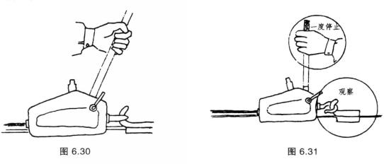 ⑧鋼絲繩固定端,必須確認其穩定程度或強度,為此,在扳動前進桿使被牽引物體剛剛受力時要一度停止扳動,觀察固定端及鋼絲繩有無異常,確認無異常后方可繼續操作,如圖6.31所示。