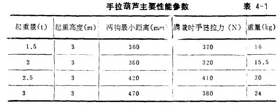 手拉葫蘆亦稱到倒鏈葫蘆,是一種最普遍的手動提升工具。根據不同工程對象,手拉葫蘆可在12m起重高度范圍選擇合適長度的環鏈。在爬升模板中常用的手拉葫蘆,其主要技術參數如表4-1所示。