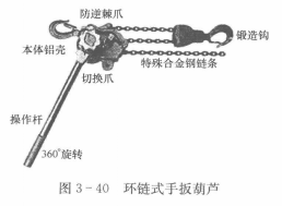 1、環鏈式手扳葫蘆(見圖3-40)。靠扳動手柄,通過傳動機構帶動起重鏈條升降重物。環鏈式手不安葫蘆是設備安裝,貨物起吊、物體固定、綁扎和牽引的理想工具,尤其是任意角度的牽引和在場地狹小,露天作業及無電源的情況下,更顯示其優越性。
