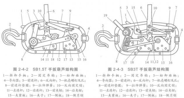 常用的手扳葫蘆有SB1.5T、SB3T兩種型號(hào)。其外形如圖2-4-1所示。SB1.5T手扳葫蘆的結(jié)構(gòu)如圖2-4-2所示。SB3T手扳葫蘆的結(jié)構(gòu)如圖2-4-3所示。