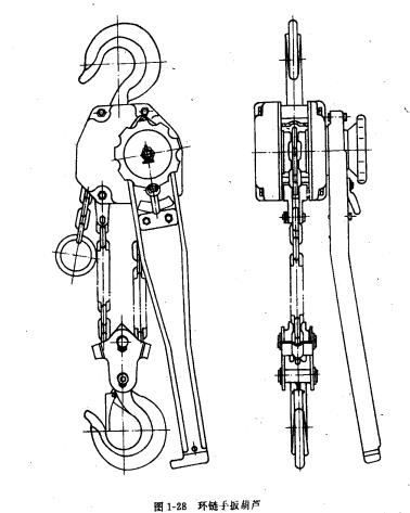 環(huán)鏈?zhǔn)职夂J的結(jié)構(gòu)如圖1-28所示,它采用一級(jí)齒輪轉(zhuǎn)動(dòng),主要有齒輪軸、齒輪、制動(dòng)器、起重鏈條、鏈輪、吊鉤、操作手柄等。