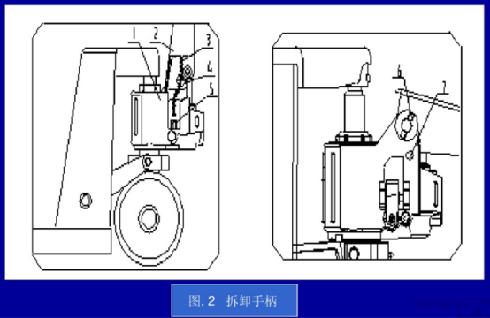 完全拆卸手柄:手柄的拆除方法如圖2:將鏈條3的端部從杠桿板5的槽內(nèi)取出來。把鏈條3從軸4的中間孔內(nèi)抽出來。將手柄扳約80°,往孔7內(nèi)插入螺絲刀。用工具榔頭和沖頭拆下彈性銷6,并把軸4拆下來,然后取下手柄。
