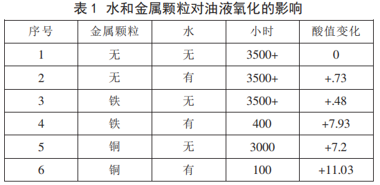 3、加速液壓油性能劣化。固體顆粒尤其是金屬顆粒,還起著催化劑作用,能加速油液氧化,導致其性能下降,如表1所示,為水和金屬顆粒對液壓油氧化影響實驗的數(shù)據(jù),實驗研究表明,金屬顆粒和水的同時存在可以家具油液的氧化速度,鐵和銅的催化作用可以使油液的氧化速度分別增加10和30倍以上。