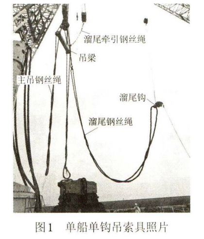 根據樁長、樁重、水深、吊耳高度及吊距,選用單鉤起重船。吊索具配置有溜尾狗鉤、溜尾鋼絲繩、溜尾牽引鋼絲繩、吊梁及主吊鋼絲繩等。先采用卡環將溜尾鉤與溜尾鋼絲繩連接;然后將吊梁、主吊鋼絲繩、溜尾鋼絲繩掛在主鉤上,采用牽引鋼絲繩將溜尾鋼絲繩上端與副鉤相連,見圖1。