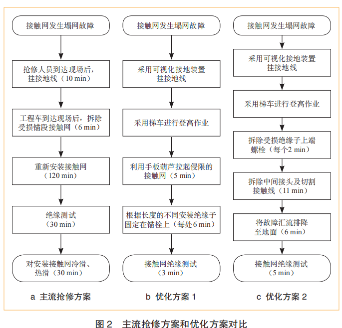對比主流搶修方案和優(yōu)化后的2種不同的方案,如圖2所示。方案1:假設(shè)發(fā)生接觸網(wǎng)塌網(wǎng)故障,定位化學(xué)錨栓未脫落時,接觸網(wǎng)未斷裂,將侵限的接觸網(wǎng)利用手扳葫蘆拉起。再次固定到懸掛定位上,保證不侵入車輛限界;方案2:接觸網(wǎng)塌網(wǎng)故障造成接觸網(wǎng)斷裂,將故障變形的接觸網(wǎng)進行切除。