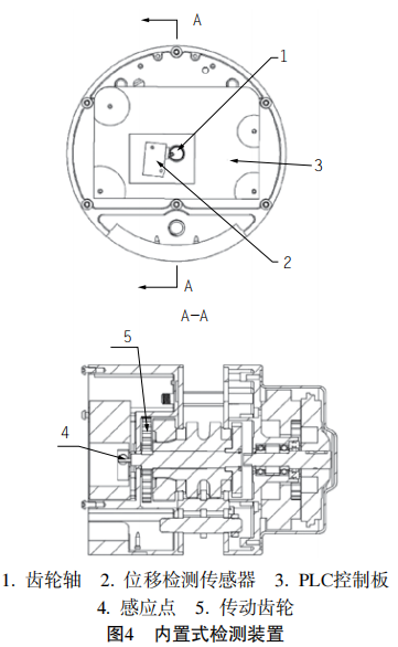 內置式高度檢測裝置如圖4所示,它主要由齒輪軸、位移檢測傳感器和PLC控制板組成。齒輪軸位于電動葫蘆內,齒輪軸貫穿PLC控制板,PLC控制板上設有位移檢測傳感器,位移檢測傳感器位于齒輪軸旁,PLC控制板與位移檢測傳感器電連接,齒輪軸上設有感應點,感應點與位移檢測傳感器配合。根據不同葫蘆的結構,在葫蘆電機的齒輪軸上,布置一個凸起或凹陷的感應開關感應點用于檢測該軸的轉動圈數。電動葫蘆必須配置控制的PLC或單片機,用于處理感應開關檢測到軸的轉動圈數。每臺環鏈電動葫蘆會根據實際鏈條長度,預先在程序中設定好鏈條的首位限位點。PLC或單片機程序設定好檢測的軸與起重鏈條運行距離的比例,再根據檢測軸轉動的圈數計算出鏈條運行的距離,實時計算出吊鉤的高度,當鏈條運行到限位點時會自動停機,起到限位的作用。