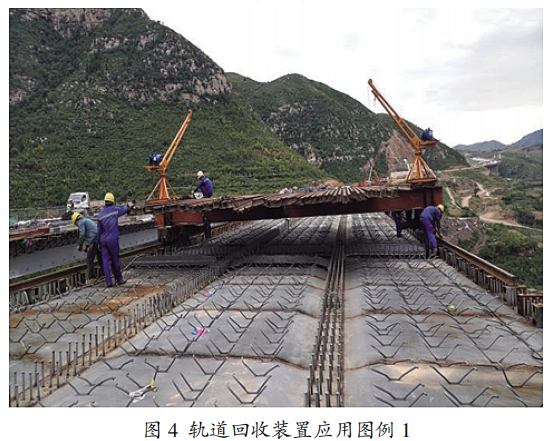 該軌道回收裝置用于鋼混橋梁架橋機架設完畢后,架橋機的軌道回收,利用旋轉中心軸、第一旋轉托盤和第二旋轉托盤可實現吊具的360毅旋轉作業,作業方便快捷,使用安全可靠,操作易控制,自重輕、施工快速,避免了物品回收時的人工轉運時耗,有利于施工成 本的節約。滑輪吊鉤裝置通過定滑輪、起吊電動葫蘆和 鋼絲繩作用,可實現架橋機軌道的高效回收。與現有技術相比,該應用于鋼混橋梁安裝架橋機 軌道回收裝置的設計結構簡單、使用方便快捷、安全可靠、易控制和成本低,采用該回收裝置規避了傳統人工進行軌道回收的耗時且效率低下問題;提升了架橋機軌道回收的效率;規避了人工回收軌道的安全隱患;快捷方便且縮短了鋼混橋梁的架設工期。