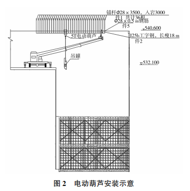 在抽水蓄能電站地下廠房土建及機(jī)電設(shè)備安裝施工過程中,因施工場地空間受限,導(dǎo)致材料垂直運(yùn)輸通道單一影響現(xiàn)場施工進(jìn)度。為解決此類問題,利用電動(dòng)葫蘆具有體積小、自重輕、操作簡單、使用方便等特點(diǎn),采用在副廠房頂拱巖體位置安裝電動(dòng)葫蘆、副廠房各樓層預(yù)留吊物孔的方式,形成副廠房臨時(shí)垂直運(yùn)輸通道,滿足土建施工期模板、腳手架。機(jī)電設(shè)備安裝期空壓機(jī)氣罐、電氣盤柜等材料設(shè)備的轉(zhuǎn)運(yùn),有效利用現(xiàn)場施工空間。從而達(dá)到提升施工效率、降低現(xiàn)場施工強(qiáng)度及節(jié)約施工成本的目的。