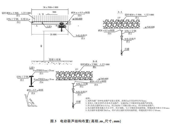 電動(dòng)葫蘆及軌道運(yùn)輸采用載重汽車,運(yùn)輸至通風(fēng)兼安全洞(靠近副廠房一側(cè)) 采用人工配合25t汽車吊及手動(dòng)葫蘆,完成125b工字鋼及5t電動(dòng)葫蘆的安裝(副廠房側(cè)),采用人工配合升降操作平臺(tái)及手動(dòng)葫蘆,完成125b工字鋼及5t 電動(dòng)葫蘆的安裝(通風(fēng)兼安全洞側(cè))。