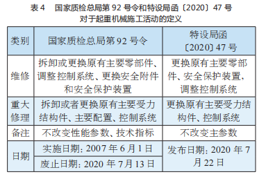 關于更換電動葫蘆的施工定性,主要由《起重機械安全監察規定》(國家質檢總局第 92 號令)和之后發布實施的《市場監管總局特設局關于明確起重機械有關名詞術語含義的通知》(特設局函〔2020〕47 號)這兩個文件予以規定,具體定義詳見表 4,其中國家質檢總局第 92 號令已廢止。根據上述文件的定義說明,對于更換同規格電動葫蘆的行為,根據國家質檢總局第 92 號令屬于重大修理,根據特設局函〔2020〕47 號屬于一般修理。