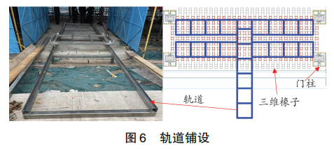 (1) 軌道鋪設:如圖6所示,整體軌道為“干”字型,軌道用30mm×30mm×3mm方管縱橫向焊接,橫桿在下、縱桿在上,為防止脫軌,在縱向邊緣用5mm×5mm×2mm小方管焊制防脫軌擋板,在高低跨處焊接支腿支撐,為了便于沿屋面X方向移動,在屋面下方焊接X向軌道,由Y向軌道運輸至屋面下方,垂直方向調換位置進行運輸。