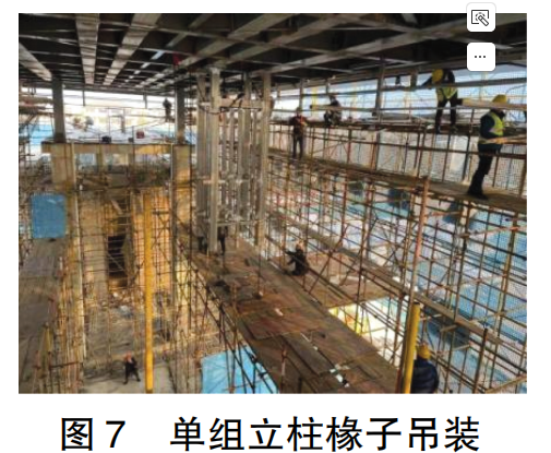 單組鋼立柱椽子的吊裝:單組椽子通過轉運車運至安裝位置,電動葫蘆緩緩吊起構件,然后操作電動葫蘆垂直運至安裝位置,操作工站在支架上安裝構件。為減少電動葫蘆提升時間,4 名操作工人同時站在4個角部進行螺栓安裝作業。構件與桁架下懸桿連接鋼板通過高強螺栓進行連接,通過雙向全站儀的復測,調節螺栓墊片調整立柱的垂直度。圖7單組立柱椽子吊裝如圖7所示,在單組構件起吊過程中,上、下作業層的安裝人員應協調一致,特別是上一層的安裝人員應注意構件吊裝過程中的垂直度和角度,防止單組構件在起吊過程中碰撞支架,也防止吊裝過程中吊帶摩擦屋頂主橫梁,下層作業人員不應在吊裝作業范圍下活動,同時注意上方墜落物品,禁止其他無關人員通行。