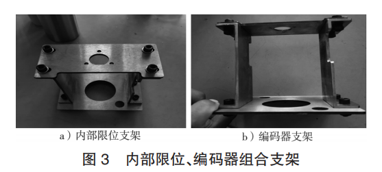 為了滿足在緊湊的環鏈葫蘆殼體內部加裝機械限位開關、編碼器的需求,需要根據 ABUS 環鏈葫蘆自帶原裝限位開關的外觀尺寸以及編碼器的安裝尺寸來設計加工固定支架。支架部件間采用可調節連接方式,立支架兩側開挖空檔,便于人工手動調整限位開關。內部限位、編碼器組合支架如圖 3 所示。