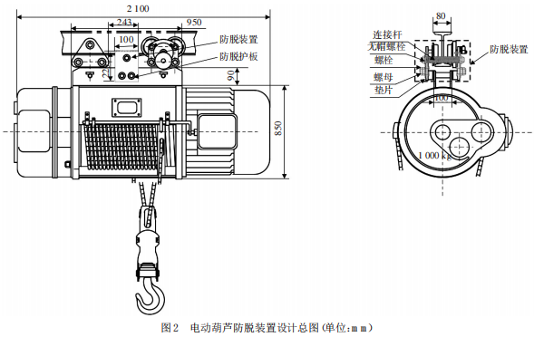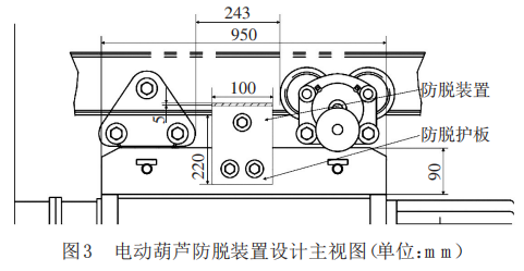 (2)防墜落裝置結構設計。原CD1-1-18電動葫蘆總長2 100 mm,總寬8 50 mm,總高1 200 mm,大梁截面尺寸140 mm×80 mm,行走電機槽寬度100 mm;并經過測量,原有的大梁與行走電機槽中心部分最小間距為243 mm,連接板板長950 mm,板寬90 mm,板厚 13 mm,可以設計并安裝 2 個尺寸為 220 mm×100 mm×40 mm 的防脫護板結構(槽鋼),通過高強度鋼連接桿形成剛性穩固的支撐框架防脫裝置,分散承重應力,防止因金屬疲勞導致局部斷裂。槽鋼與主體結構采用螺栓配合緩沖墊片聯接,避免摩擦損耗,延長使用壽命;為便于定期檢查與更換槽鋼,連接桿采用快拆式結構。